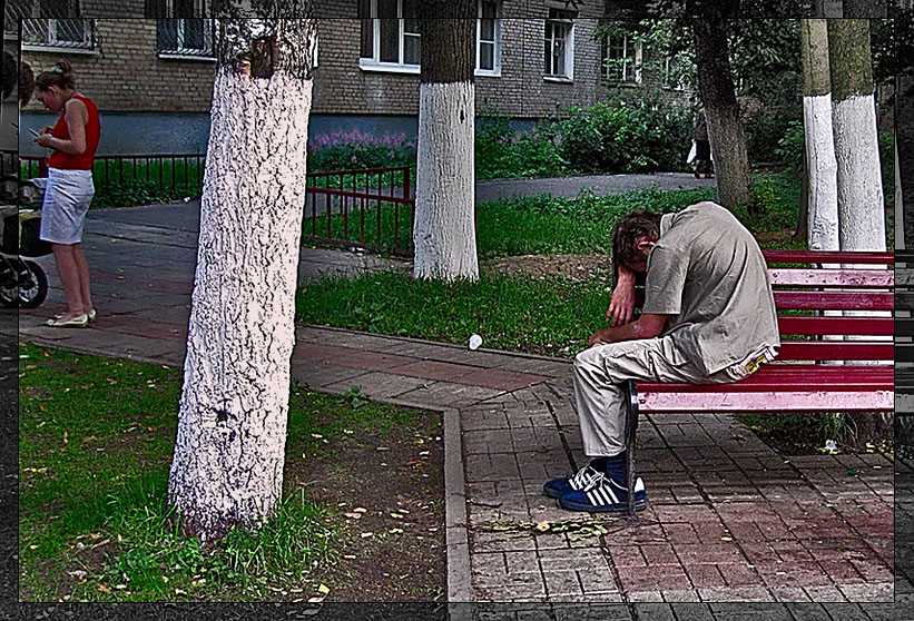 На фото не бомж, вполне домашний мужик. Слегка разморило, уснул. Всё в рамках.